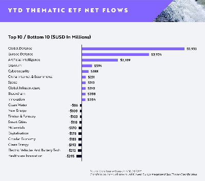 Globala försvars-ETFer fortsätter att leda flödena hittills i år (YTD) med +5,93 miljarder dollar i nettoflöden, med europeiska försvars-ETFer på andra plats med +3,92 miljarder dollar i nettoflöden.