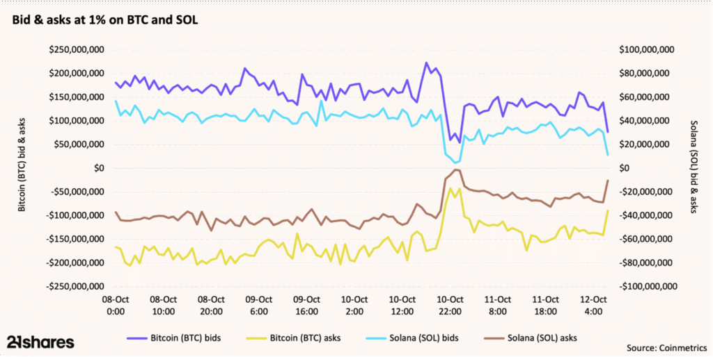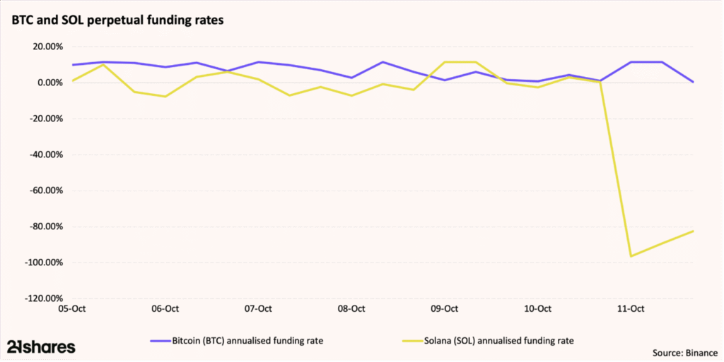 Funding rates flipped sharply negative—particularly in Solana—signaling an abrupt pivot from leveraged longs to short positioning. In some altcoins, liquidity deteriorated so severely that price wicks reached near-zero levels before stabilizing.