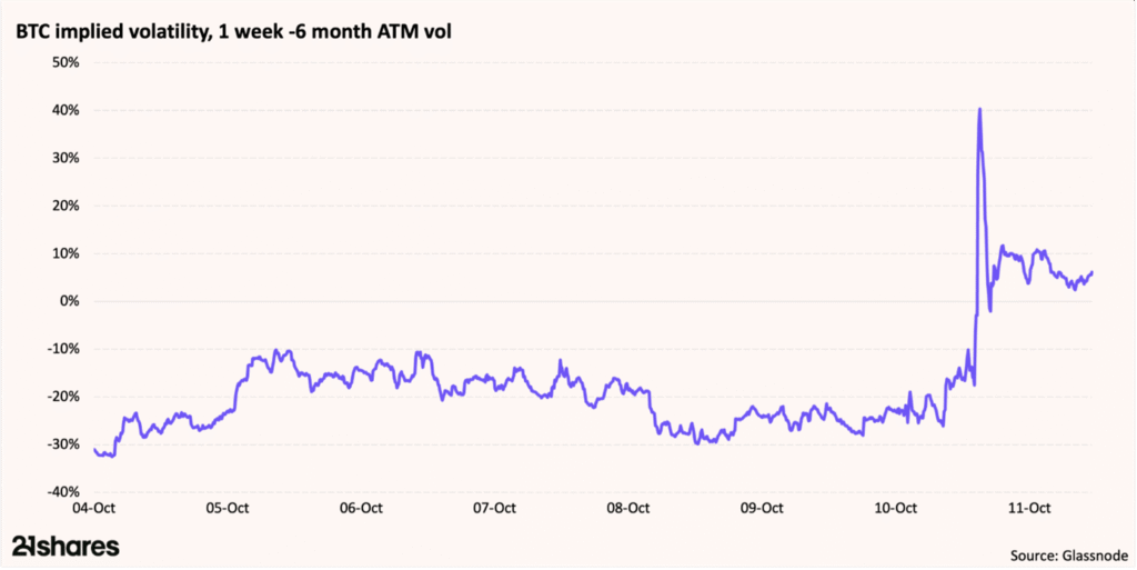 Volatility spiked dramatically, with Bitcoin implied volatility reaching levels not seen since the FTX collapse. While unsettling, such spikes are often short-lived and tend to normalize as market depth recovers.