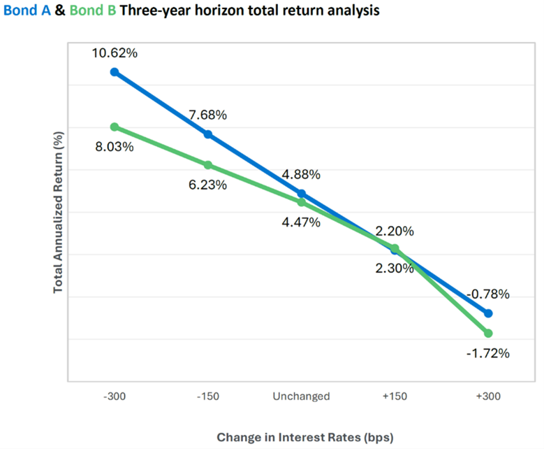 • Men vad händer om vi beräknar totalavkastningen för dessa två obligationer (över en treårshorisont) i olika räntescenarier? Shape Management® berättar en annan historia.